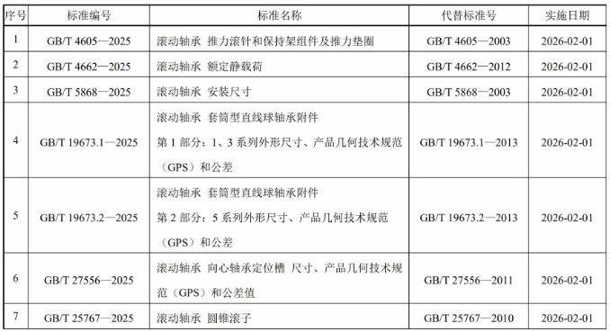 2025年10月31日,国家市场监督管理总局(国家标准化管理委员会)以2025年第29号中国国家标准公告批准发布了758项推荐性国家标准和6项推荐性国家标准修改单。本次公告中涉及滚动轴承领域的推荐性国家标准7项,如下所示: